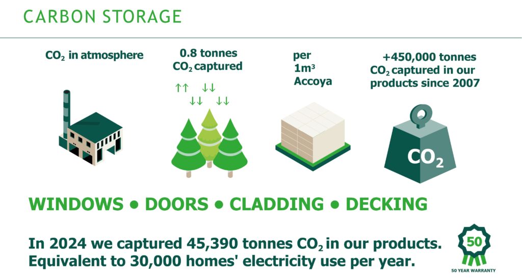 The carbon is stored in the living tree, but will also remain stored once the tree is felled and the wood of the tree is used for products such as Accoya® and Tricoya®. As a consequence, CO2 is locked out of the natural carbon cycle during the lifespan of the wood or wood product.