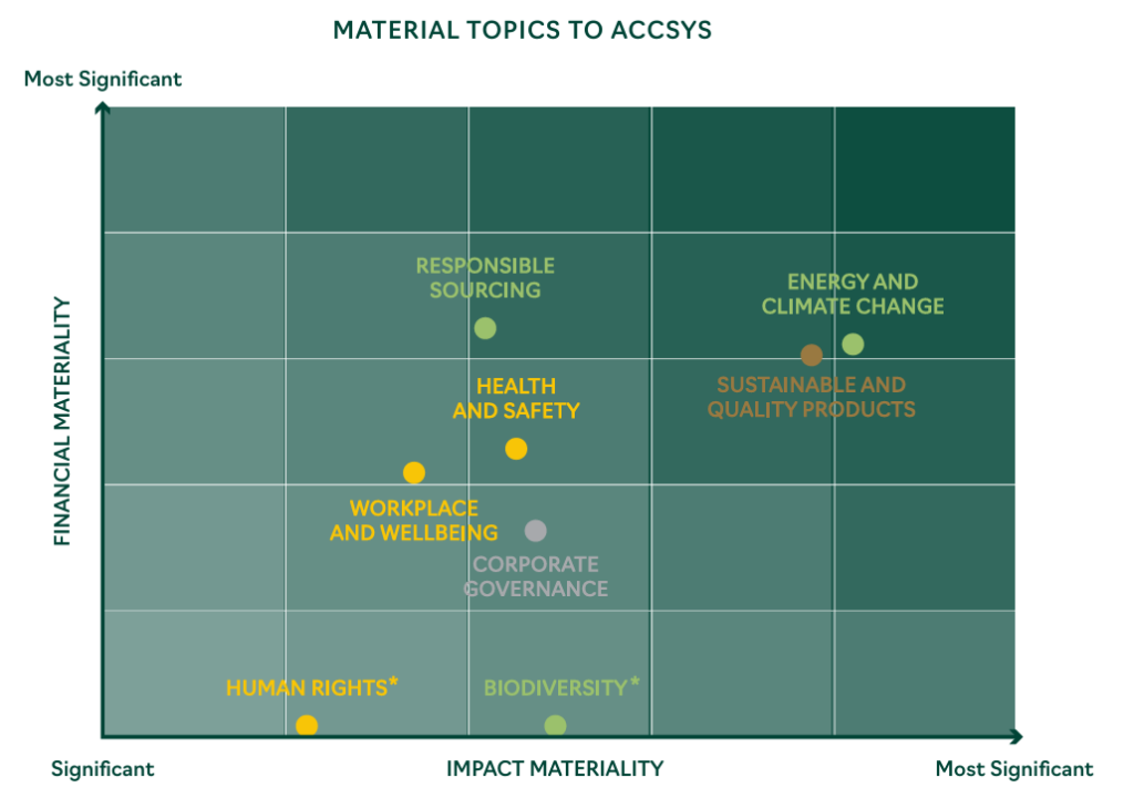 Als onderdeel van onze inzet voor goed bestuur hebben we in 2025 een dubbele materialiteitsbeoordeling uitgevoerd om de belangrijkste materiële risico’s, kansen en impacten van Accsys in kaart te brengen. De beoordeling toont aan hoe duurzaamheidskwesties het bedrijf beïnvloeden (financiële materialiteit) en hoe de bedrijfsvoering van Accsys mensen en het milieu beïnvloedt (impactmaterialiteit). De volledige bevindingen hiervan vormen de basis van ons Duurzaamheidsplan, dat onze strategische aanpak beschrijft voor het beheren van duurzaamheids- en klimaat-gerelateerde risico’s, impacten en kansen. De risico’s die zijn geïdentificeerd als onderdeel van de dubbele materialiteitsbeoordeling worden meegenomen in het bredere Enterprise Risk Management-proces van Accsys.